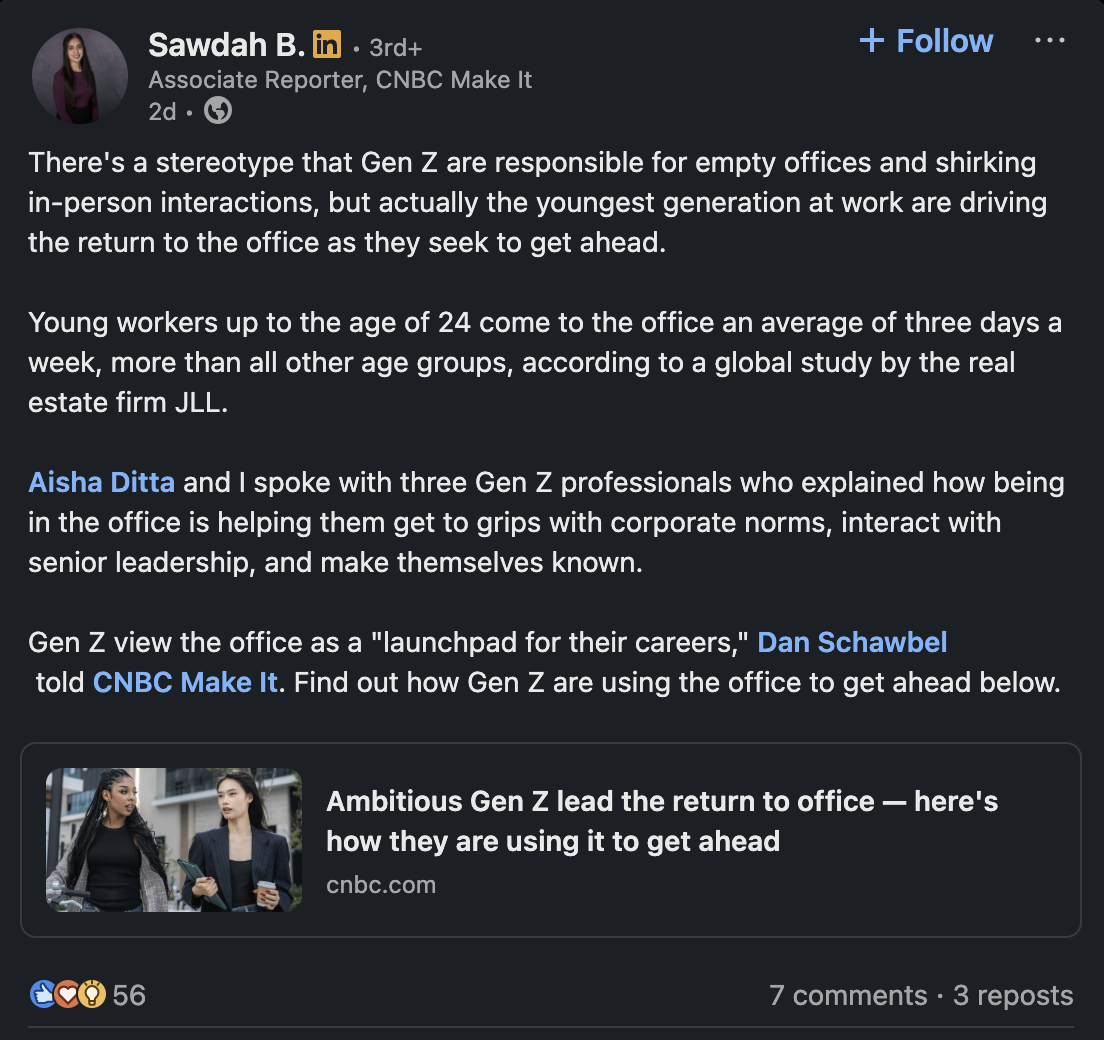 The story seems to buck the prevailing stereotype that younger workers are digital-first and office-averse and instead paints Gen Z as eager to embrace cubicles, commute, and corporate culture. The narrative is reinforced with three anecdotal interviews and a convenient statistic: workers up to age 24 reportedly spend more time in the office than older generations.