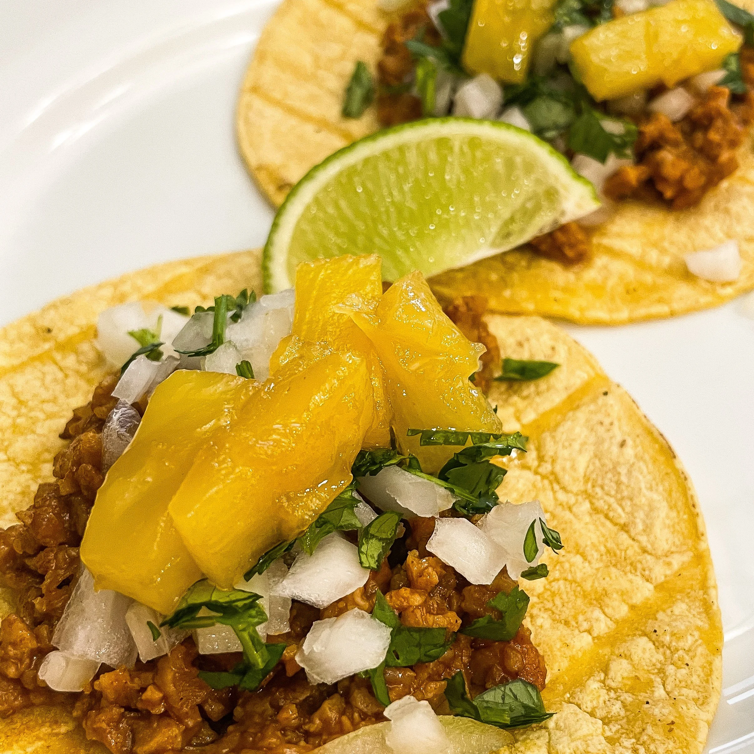 6. Warm tortillas and build tacos by adding TVP, white onion, cilantro, and top with warm pineapple. Serve with a wedge of lime.
