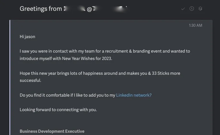 Making this up is just not a great sales strategy. i’ve never heard of this person, this company, and i’ve never been in contact with them.