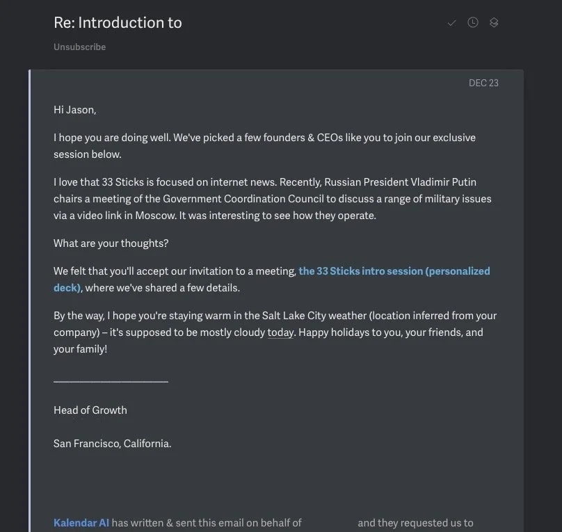 🚫 Don’t send mixed messages. Clearly this email was AI generated, don’t then say you have picked CEOs to join an exclusive session. If it was exclusive, you would have written a personal email.